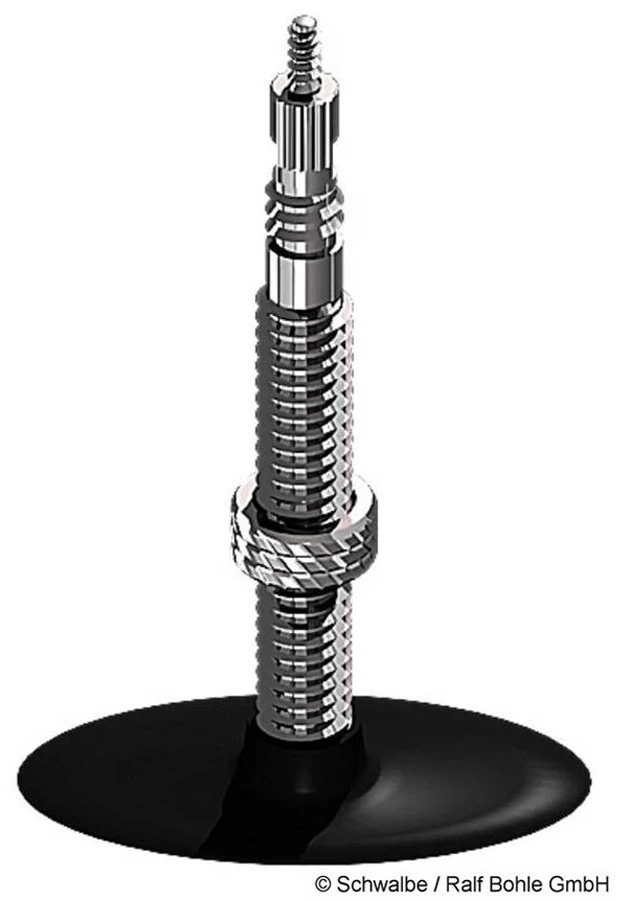 - Toutes les valves sont nickelées et munies d’un filetage. L’insert de la valve est toujours remplaçable. Chez Schwalbe, même les chambres à air dotées de la valve classique pour vélo peuvent être testées en pression et ont un joint de valve très résistant à la pression. Pour couronner le tout, chaque chambre à air est dotée d’un capuchon anti-poussière esthétique en polycarbonate transparent.