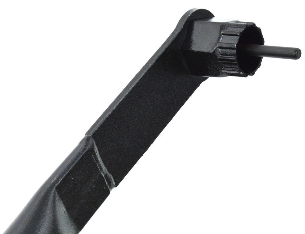 Extracteur à couronne en version extra longue pour desserrer les bagues de fermeture des cassettes compatibles Shimano et des freins à disque Center-Lock. L’extracteur à couronne permet de desserrer la bague de fermeture qui relie solidement la cassette à la roue libre. La roue libre dispose d’un filetage et sert ainsi de contrepartie à la bague de fermeture. Pour desserrer cette liaison, la roue libre est maintenue sur la cassette à l’aide d’un fouet à chaîne, puis la bague de fermeture est desserrée à l’aide de l’extracteur à couronne. La cassette peut ensuite être retirée. Le fouet à chaîne et l’extracteur de couronne sont donc toujours utilisés ensemble.