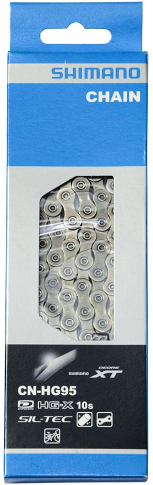 La chaîne directionnelle super-mince Shimano XT CN-HG95 10-speed HG-X spécialement conçue pour le VTT et le trekking avec un design anti-salissures. Cette chaîne permet un changement de vitesse plus fluide, un gain de poids et une augmentation des performances globales du système.